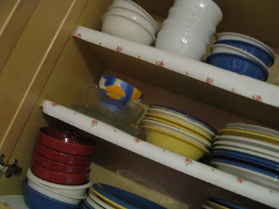 I just did my zen dishwasher emptying. I get all in the moment, and mindfully put away all those sparkly clean dishes, and wow, what an abundance. Do you think it matters that some of these dishes came from WalMart? No one minds that when I put out little red bowls full of nuts or other tidbits, or make my Country Captain curry or serve Costco cheesecake. And I love all these prosaic little plates and bowls. They came to me since my third divorce, when I divested myself of bunches of stuff I never wanted to see again. Objects, you see, tend to get all bound up in memories and emotions for me. All of these were bought by ME, for ME, because I wanted or needed them. They are like precious jewels, all neatly piled on shelfpaper printed with rosebuds. It is good once in a while to reflect on how sweet my life actually is. Everything I need is here with me in the little yellow house, even a box of those amazing almond butter cookies from TJs. But that's another cupboard entirely!