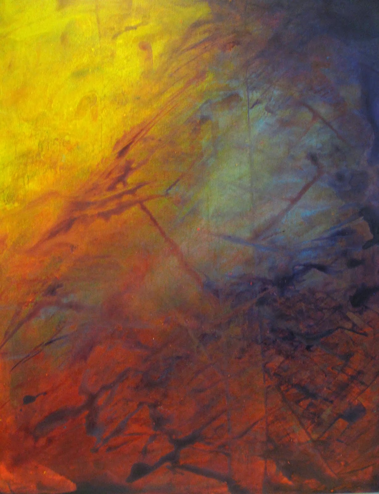 The cowwoman has been hung out and dried lately. This occasions angst. Angst occasions paintings with a whole lot of kinetic energy. I learned this new process from a weekend workshop. Couldn't get his style, though. This work is the result of many, many layers of paint, thinly applied and each layer sealed with a layer of acrylic varnish. I just love this piece. It is visual proof of the healing process I am experiencing in therapy. And my therapist wants to buy it! I don't know what "artful" is, but I think this is close to it. It is complicated, full of energy, a burst of creativity I didn't know I had in me. I just ordered 6 more cradled boards like this one to work on, and oeuvre # 2 is currently reposing on the board. I slap at it several times a day. It is taking its time revealing itself to me. This is okay. Probably I will begin another, then come back to it. It's really all just amazing fun, art.